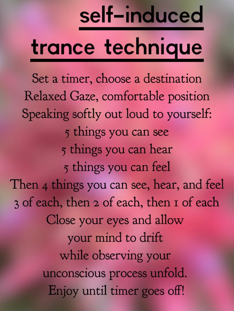 In light of the challenges we’re facing I wanted to share with you a technique for self-hypnosis. Although in some ways we cannot achieve quite the same specificity working on our own as we can in 1:1 sessions, I do find self-hypnosis very nearly as effective and I practice it all the time! The more trance work you do, whether it’s hypnosis, Breathwork, creative process, or even daydreaming, the more skilled you become at navigating and shifting your own consciousness.